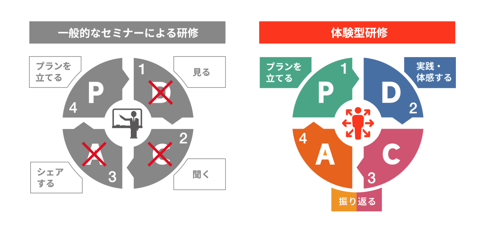 一般的なセミナー型の座学研修ですと、受講生は「講義を聞く⇒お互いにシェアする⇒行動計画を立てる(Plan)」という学習サイクルしか回すことができません。これでは、行動計画を立てたとしてもいざ現場に戻ると日常業務に忙殺されて、実行に移されないまま忘れ去られてしまいます。 しかし、体験型研修では、「プランを立てる(Plan)⇒実践・体感する(Do)⇒体験を振り返る(Check&Act)」というように研修中、何度も研修テーマに沿った体験を反復学習していくことができるため、研修中に頭に入れた知識を『身につける』ことができるようになります。