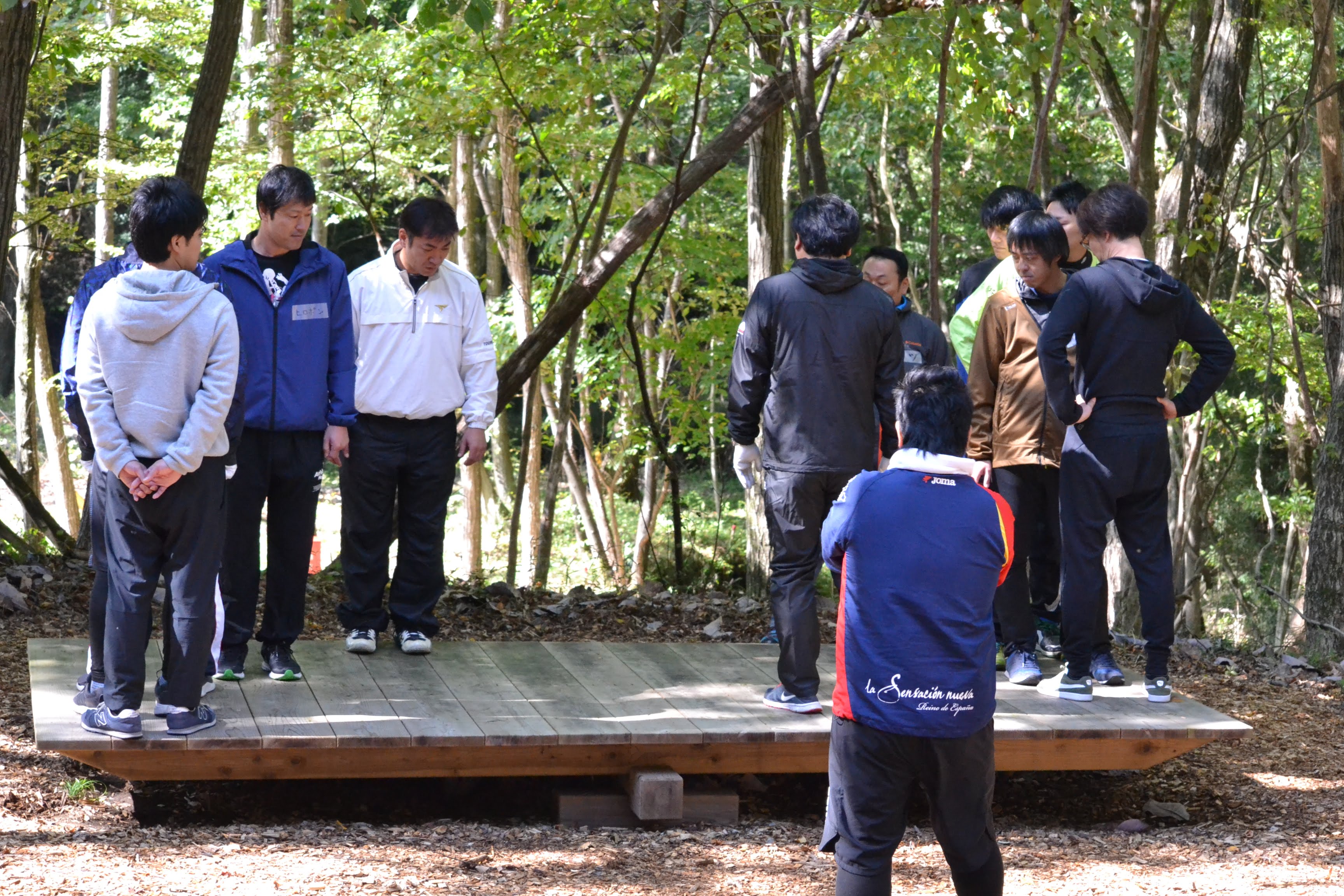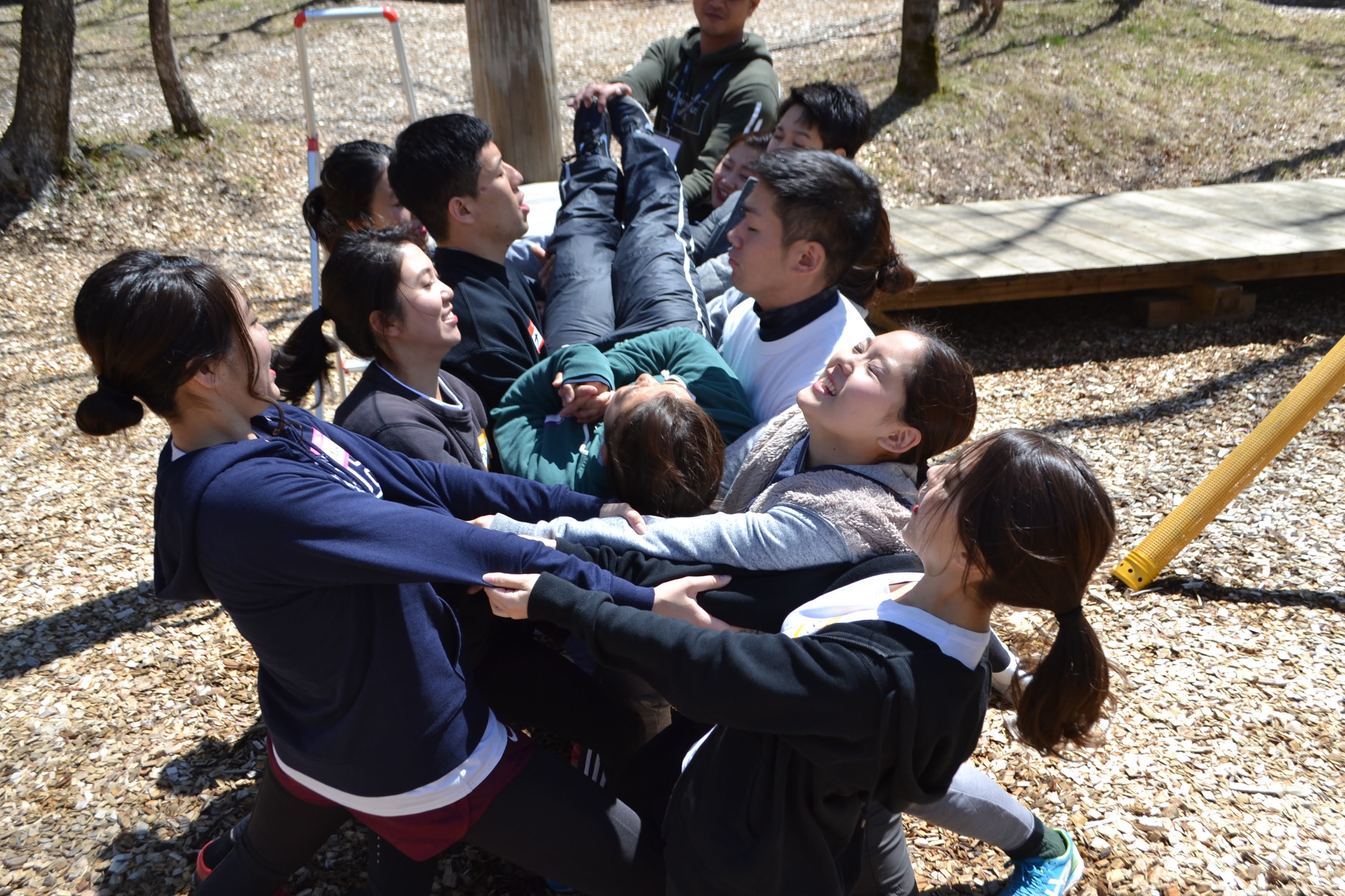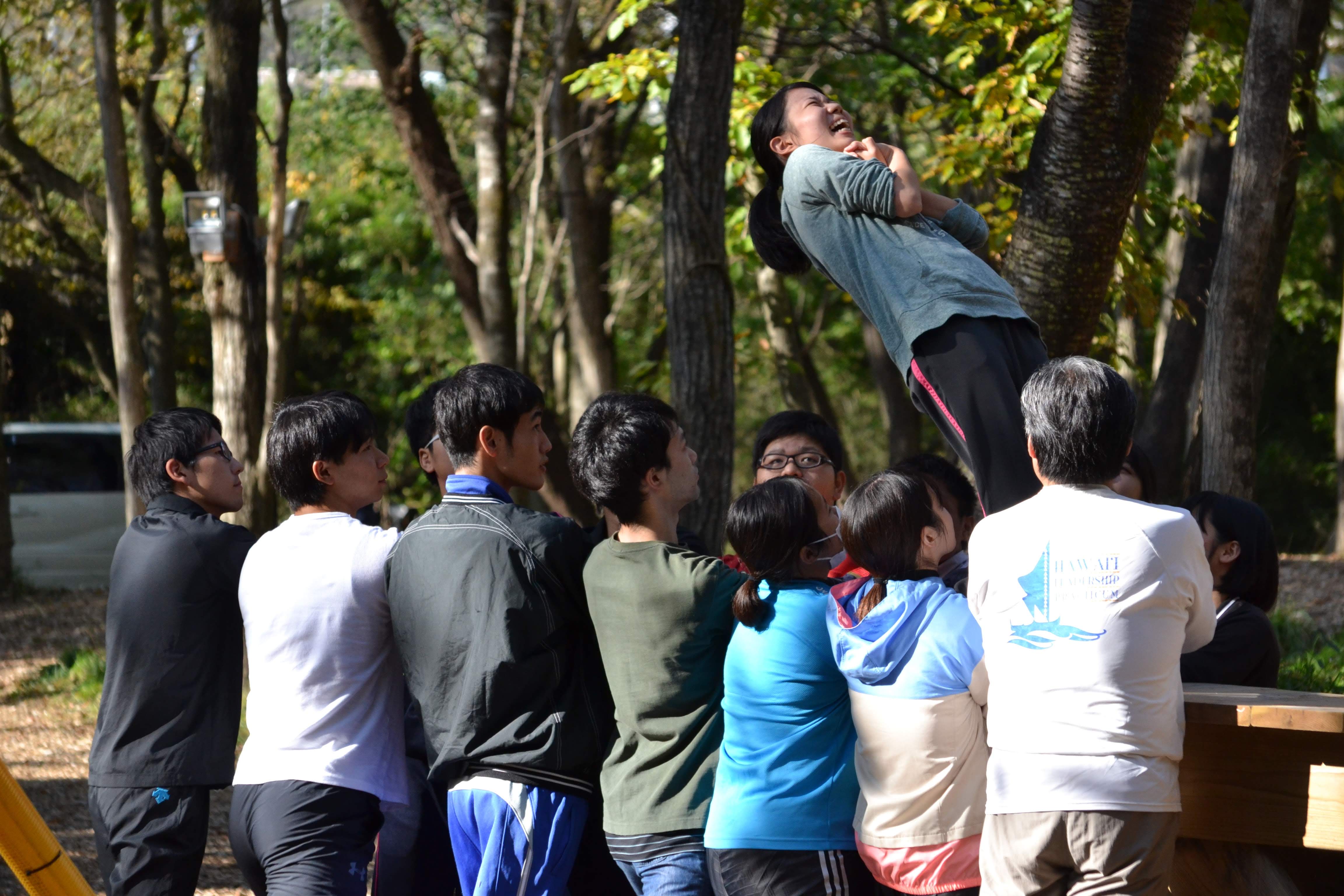 地上1.5mほどの高さに設置された木製の台に、1人のチャレンジャーが背中から地面に向かって落下するので、落ちてくるチャレンジャーをチーム全員で受け止めるワークです。