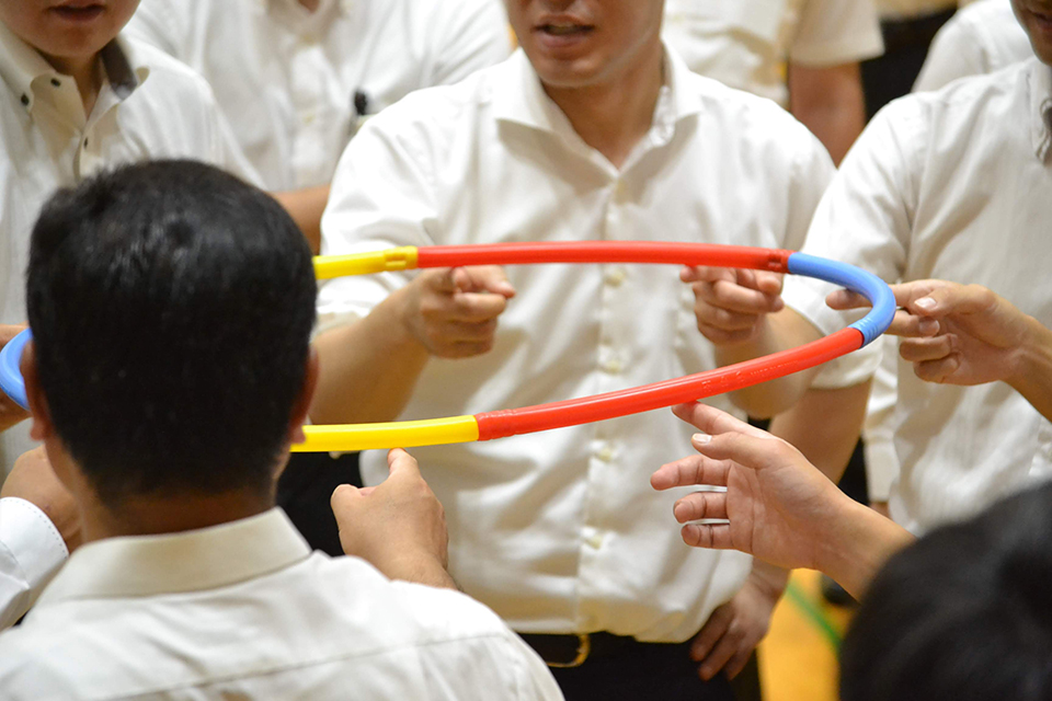 フラフープが非常に軽く作られているため、チームに一体感が出ない限り達成できません。ワークの達成を通して、チームビルディングの過程を体験できる設計になっています。